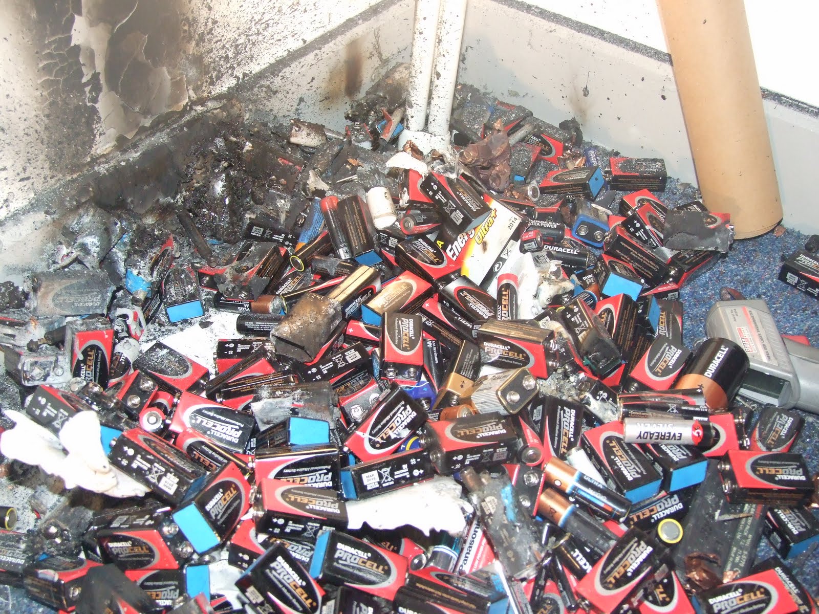The bin where the fire started contained hundreds of batteries (I gave up counting after 100) of various sizes, voltage ratings and technologies: Zinc/Carbon, Zinc Chloride, Alkaline, Lithium, Li-ion, AA, C, D and ‘exotic shapes’. (See photo at top) I found no coin batteries. However the predominant type was the 9 volt PP3 (MN1604) ‘smoke alarm’ battery with two terminals at one end. Clearly, if you chuck lots of these batteries in a bin sooner or later you will get a short circuit.